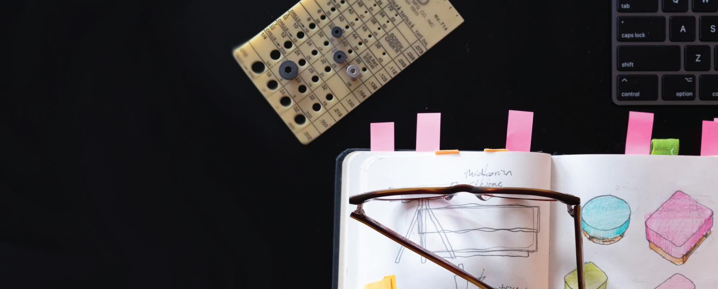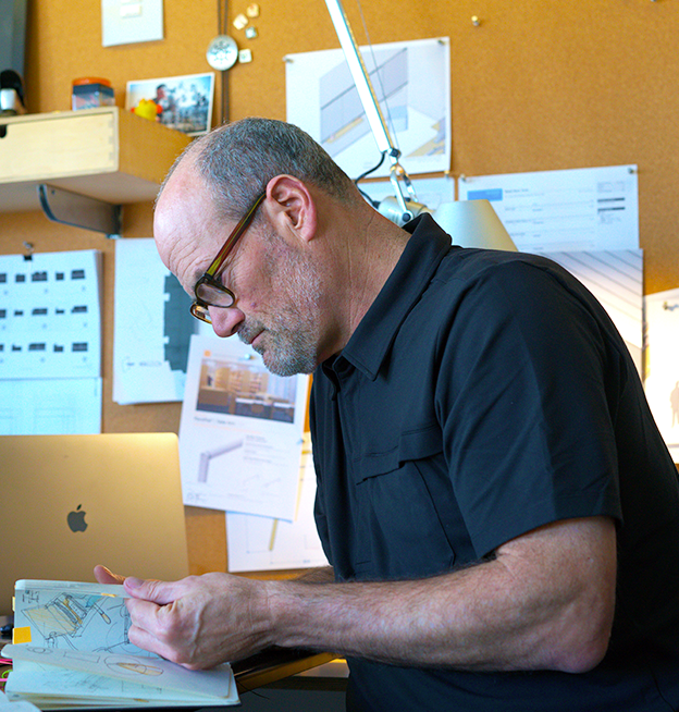 Upon entering the space, we noticed the attention to detail in the organization of fabrics and finishes. A well curated collection of art and design books scale bookshelves and layers of trace paper with Brian’s shop drawings are tacked onto corkboard. Evidence of the creative process is clear, with stacks of pamphlets and notebooks, a worn in workstation and scattered pens.
