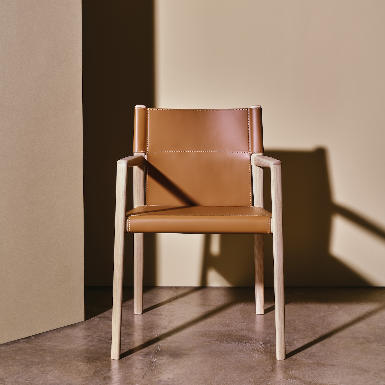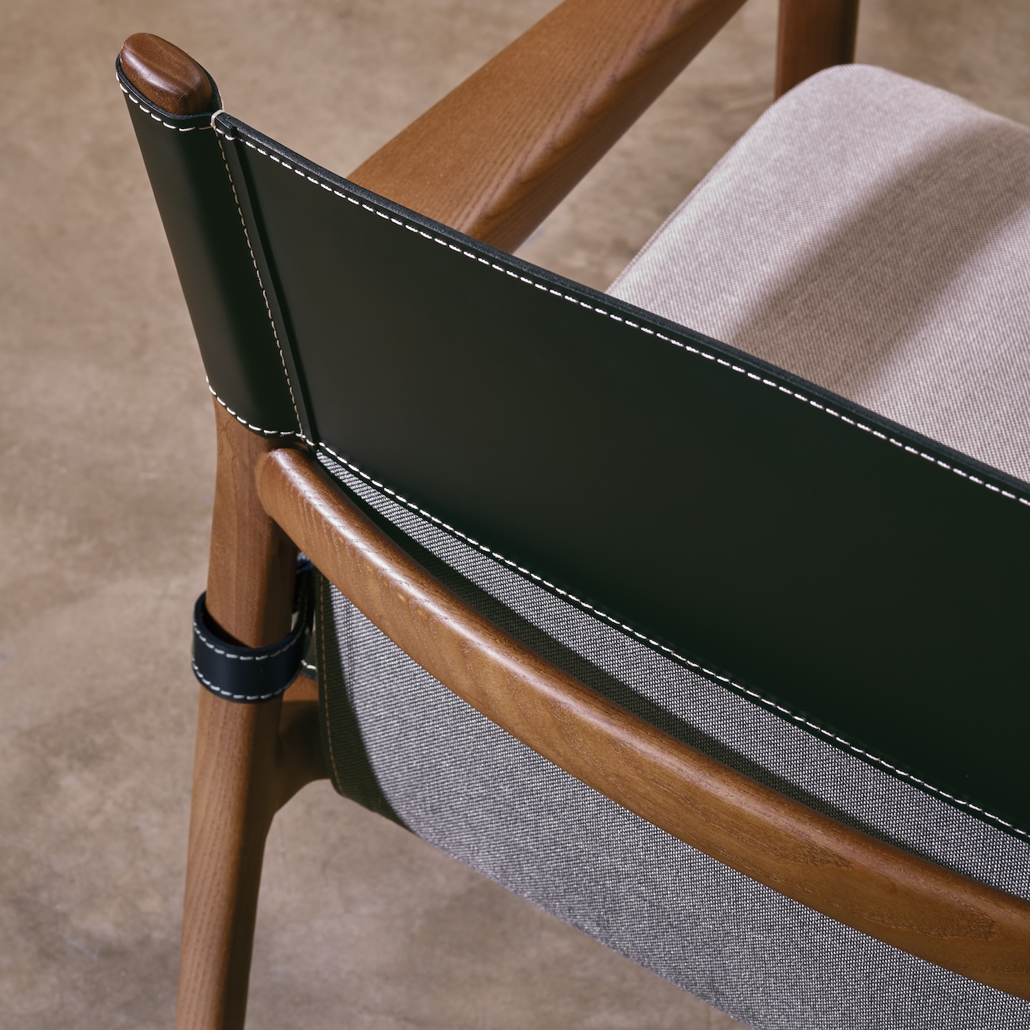 Since we are in this beautiful showroom, I am going to show you this chair that I love a lot, it’s called Casta. It’s a very beautiful lounge chair with wood detail on the back, it’s made with belt leather, it’s sort of a Spanish Castilian chair, inspired by what they put in castles. The way it’s manufactured, it can be reupholstered easily. It’s a gorgeous chair, beautiful details. I love this chair.